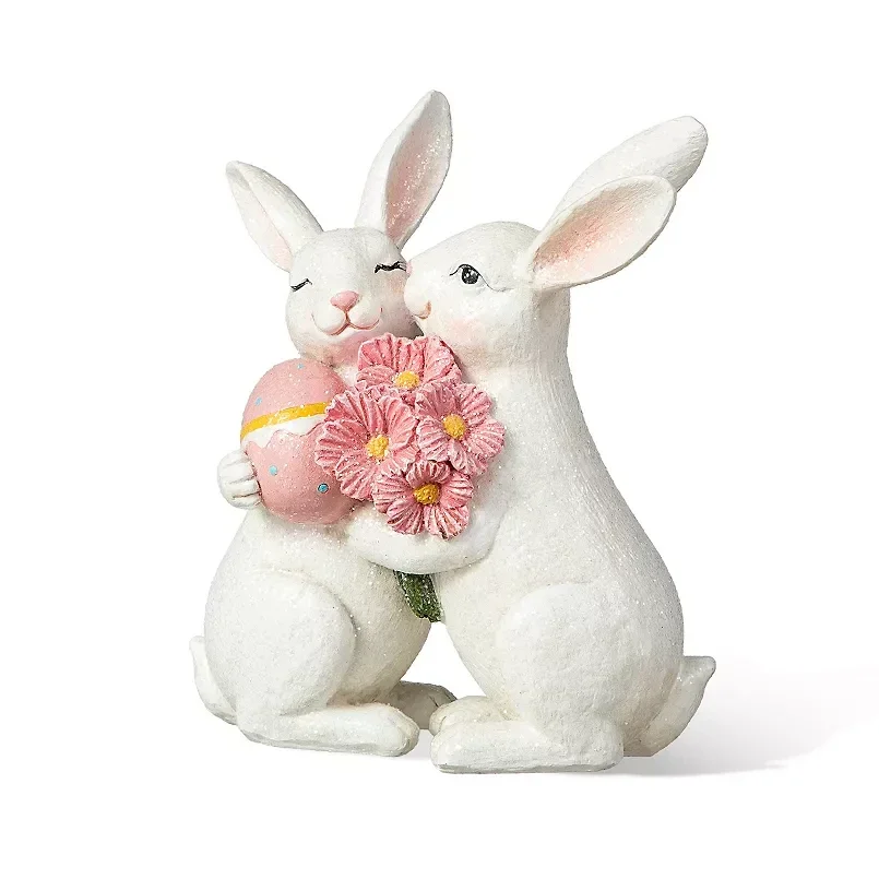 This Easter spring table decor captures the essence of love and companionship with two white rabbits hugging tenderly. The closed eyes of the left bunny convey contentment, while the gaze of the right one exudes gentleness, creating a heartwarming scene that warms the heart. Holding pink flowers and pastel eggs adorned with yellow stripes, the rabbits embody the joy and renewal of spring. Brighten your home with these adorable Easter bunnies, creating a festive atmosphere. Perfect for tabletops, they bring Easter's spirit to any room.